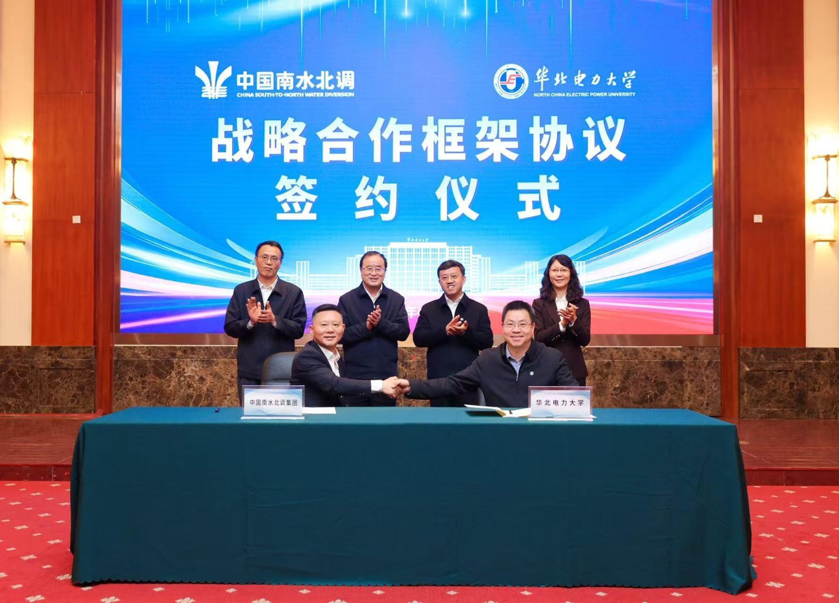 4月14日,中国南水北调集团有限公司党组书记、董事长汪安南一行访问tyc122cc太阳成集团,校企双方签署战略合作框架协议。公司党委书记汪庆华,中国南水北调集团党组书记、董事长汪安南出席并讲话。董事长、党委副书记毕天姝主持签约仪式。党委常委、副董事长檀勤良,中国南水北调集团党组成员、副总经理周厚国,党组成员、副总经理李孝振参加活动。