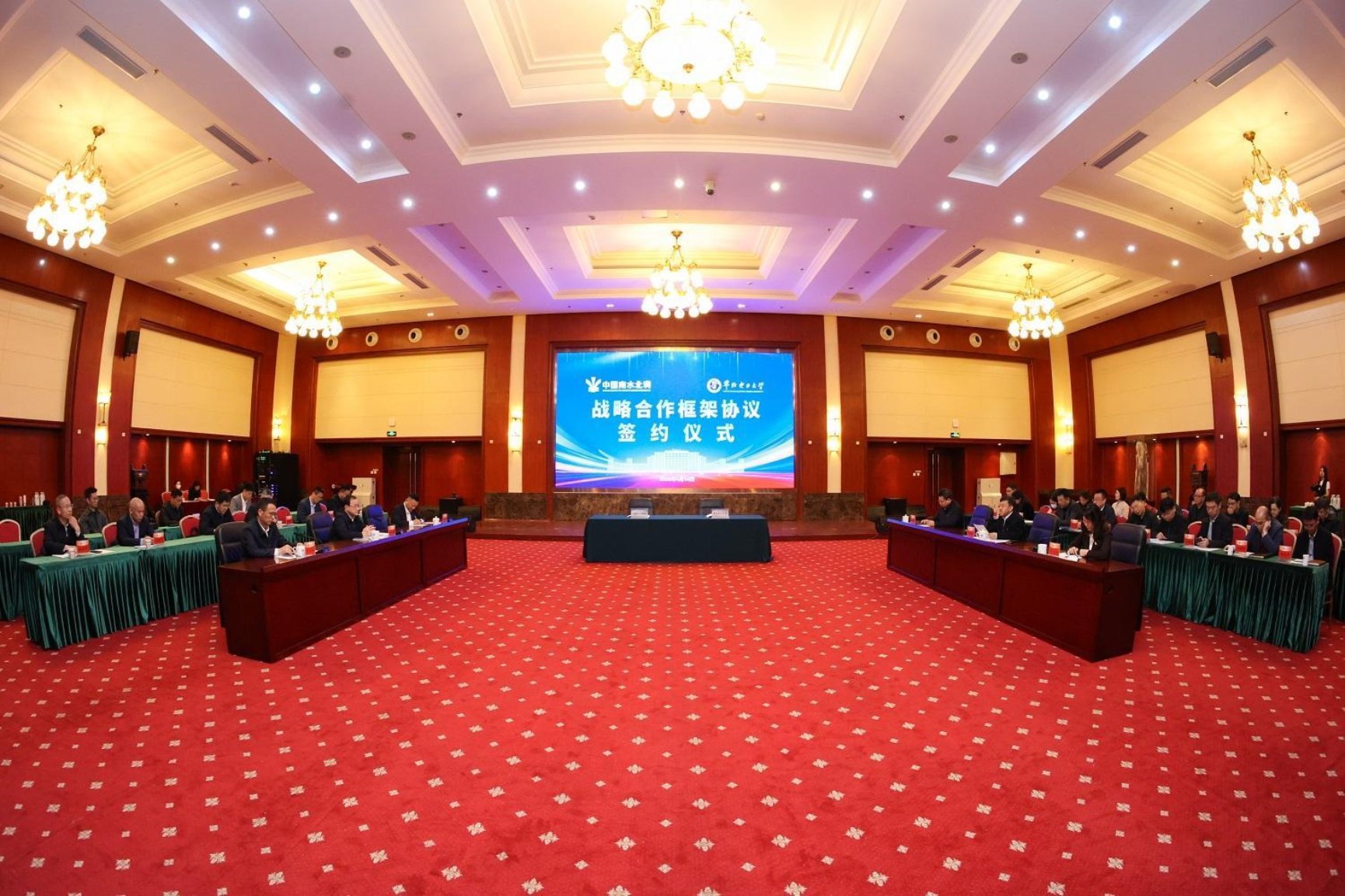 中国南水北调集团办公室主任杨杰,战略投资部主任杜孝忠,市场发展部主任杜国志,组织人事部主任刘远书,新能源公司党委书记、董事长侯社中,科技创新部副主任卢健;公司相关单位负责人参加会谈与签约仪式。
